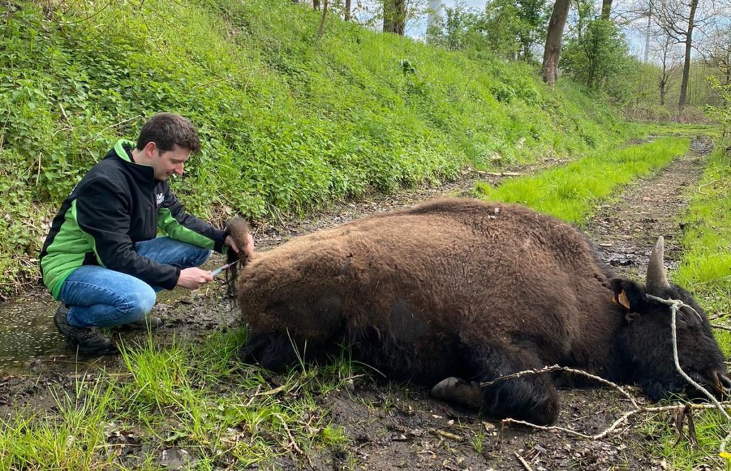 Dierenarts Theo Martens, welbekend bij de mensen die ons al langer kennen, staat ons ook nog bij met raad en daad. Zo kwam hij deze week nog voor een interventie bij de bizons naar Olmen afgezakt. Hun jaarlijks bloedonderzoek betreffende IBR moest weer gebeuren. ()