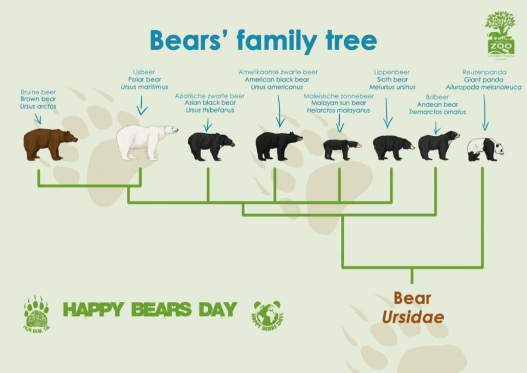 Maar deze dag gaat niet specifiek over onze beren, of specifiek over de Europese bruine beer. Deze dag gaat over alle beren! Zo krijgen wij ook eens de kans om over beren te spreken die niet in ons park zitten. Er zijn momenteel 8 soorten beren: