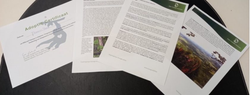We kregen een adoptiecertificaat en wat uitleg over chimp Hiila en haar zoontje Cheempo. Zij leven in het Dindefelo Community Nature Reserve waar Jane Goodall Institute Spain (IJGE) sinds 2009 een onderzoek en conservatieprogramma hebben.