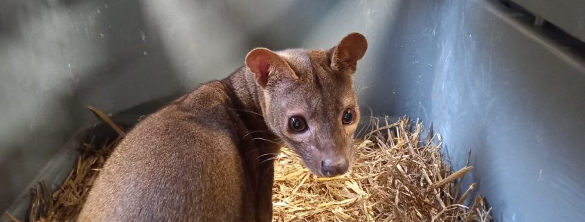 De fossa of fretkat (cryptoprocta ferox) is een zeldzaam roofdier dat in het wild enkel voorkomt op het Afrikaanse eiland Madagascar. In 2016 kwamen er twee fossa’s naar de toenmalige Olmense Zoo, nu Pakawi Park. “Het ging om twee broertjes die we toevertrouwd kregen toen we de minimumnormen voor het houden van deze soort hadden ontvangen van de overheid”, zegt Robby Van der Velden, bioloog van Pakawi Park. “Het tweetal was geboren in Duisburg, maar kwam toen toe vanuit Berlijn waar ze verbleven in afwachting voor hun plaatsing.”