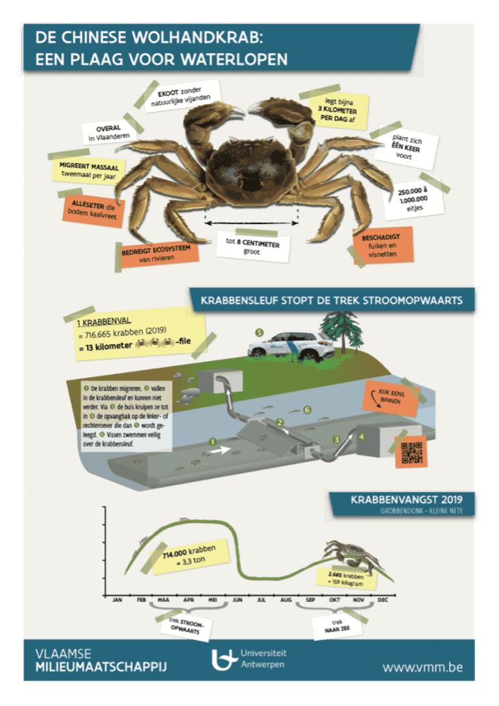 Vaak krijgen we de invasieve soorten niet meer weg. Maar: in Grobbendonk zet de Vlaamse Milieu Maatschappij zich in om het kwetsbare stroomgebied van de Kleine Nete te behoeden voor een invasie van Chinese wolhandkrabben. De krabben brengen namelijk vernieling aan door met duizenden tegelijk door de waterloop te kruipen en planten los te woelen, af te scheuren of op te eten. Met een ingenieuze krabbenval worden de kleine krabbetjes gevangen wanneer die in het voorjaar stroomopwaarts migreren. In de Scheldemonding of in de Noordzee paaien de volwassen wolhandkrabben. Eens de jonge krabben groot genoeg zijn, starten ze hun reis naar de binnenwateren waar ze daarna in enkele jaren uitgroeien tot indrukwekkende handgrote krabben. De volwassen dieren trekken in het najaar weer terug naar zee om te paaien. Telkens trappen ze massaal in de krabbenval. Hoe die val werkt, zie je op deze infografiek: