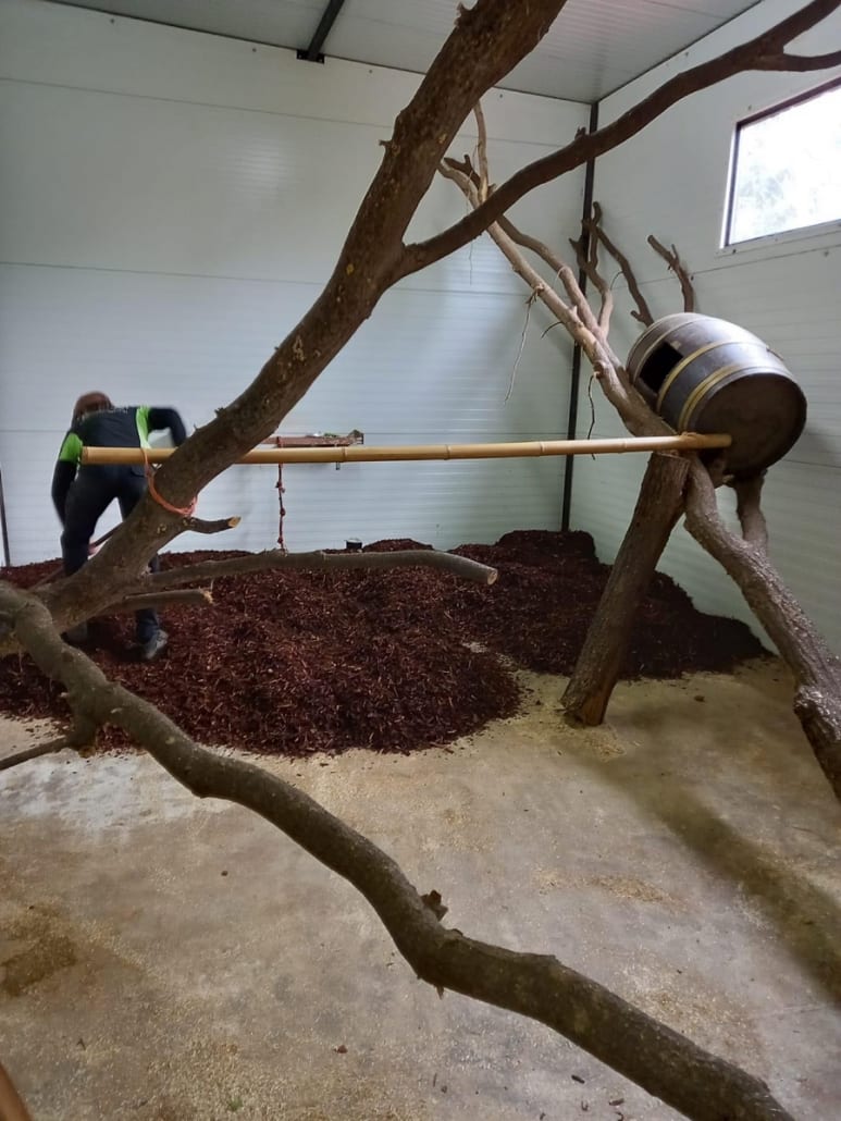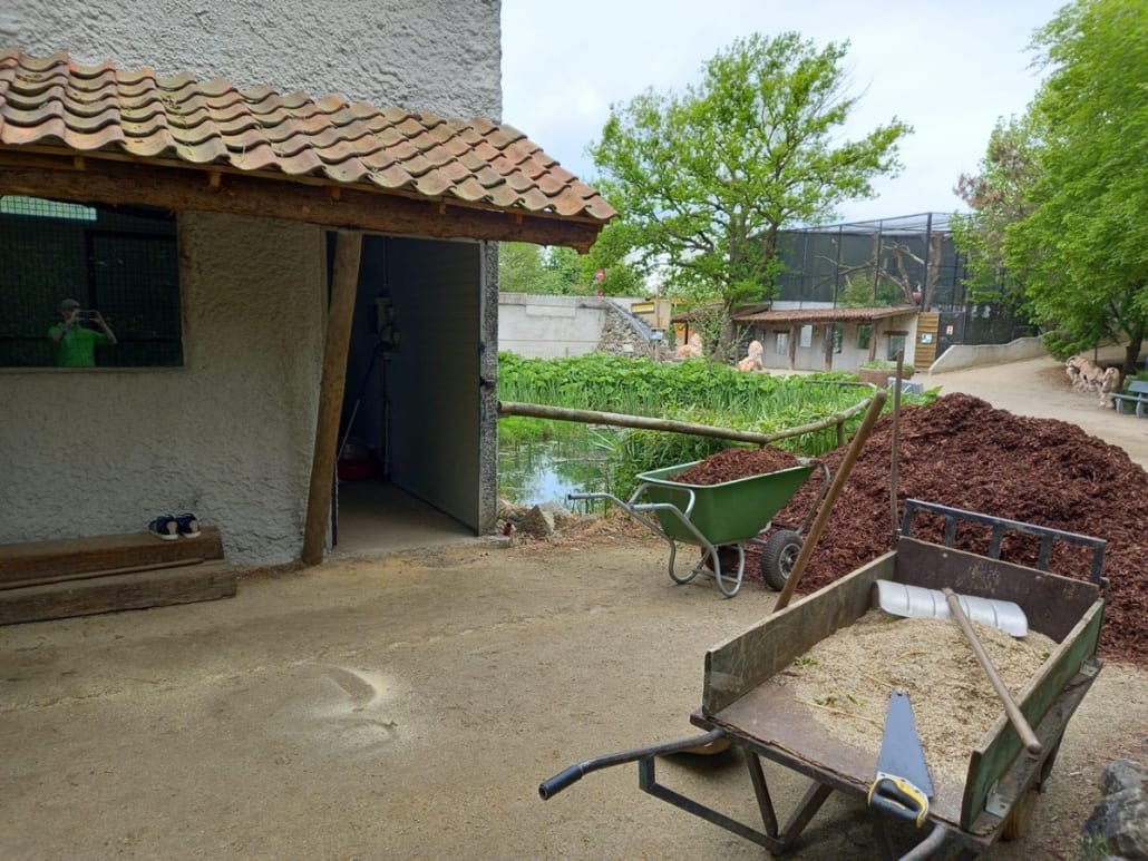 De firma Agricon uit Ham heeft ons alvast een gedeelte van onze bestelde boomschors geschonken om ons op weg te helpen. We willen namelijk testen hoe de biobodem werkt bij enkele kleine verblijven. Zo weten we exact wat we wel en niet willen wanneer we ons nieuw chimpanseeverblijf bouwen. Voor Monkey Island hebben onze architecten 50 cm biobodem ingecalculeerd. Als je verblijf hierop voorzien is, staan de schuiven en de deuren namelijk een stukje hoger dan normaal.