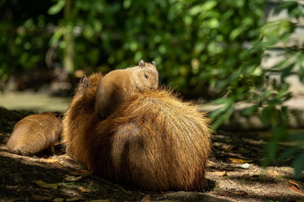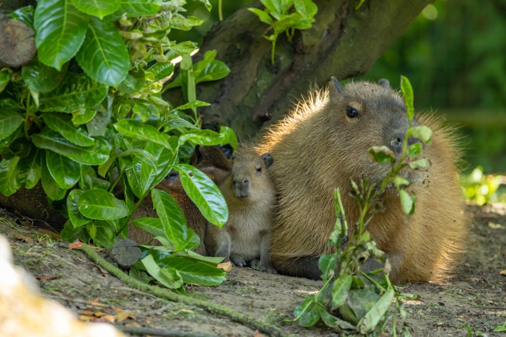 Capibara’s zijn knaagdieren, de grootste ter wereld zelfs. Ze worden ook wel waterzwijnen genoemd omdat ze ongeveer dezelfde lichaamsbouw hebben als varkens. Je zou het niet zeggen maar ze zijn daarentegen nauw verwant aan de cavia. En net zoals bij de cavia komen de jongen kant en klaar ter wereld. De draagtijd is dan ook 150 dagen en geen 20 dagen zoals bij een muis bijvoorbeeld. Binnen de knaagdieren heb je namelijk twee verschillende groepen met enorme verschillen. Enerzijds heb je de stekelvarkenachtigen, waartoe ook onze capibara’s behoren. Anderzijds heb je groepen met vele naakte en blinde baby’s zoals de eekhoorns en de muisachtigen. Baby capibara’s lopen al rond met ogen en oren wijd open en eten na enkele dagen al vast voedsel, al blijven ze ook nog wel enkele maanden zogen. Ze kunnen relatief lang bij de ouders blijven, zelfs al worden er jongere broers en zusjes geboren. Je kan ze dus zeker nog het hele seizoen komen bewonderen.