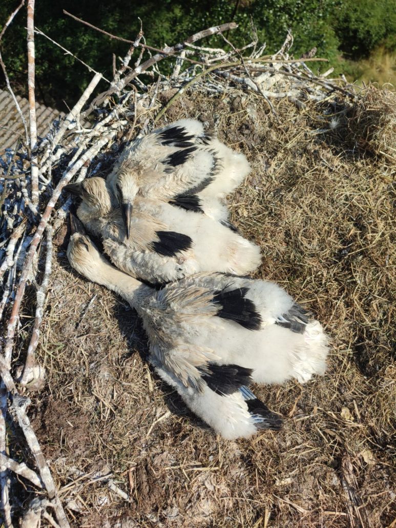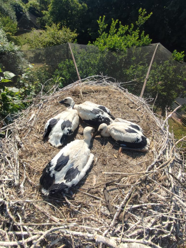 Het tweede nest ooievaars, met 3 jongen, heeft een veiligere plaats gekozen bij hun naaste verwanten op de grote wandelvolière. Zo hebben ze de hele dag zicht op de hamerkopooievaars, rode ibissen, Puna ibissen, strohalsibissen, kleine zilverreigers, koereigers, kwakken, witgezichtreigers en de Flamingo’s.