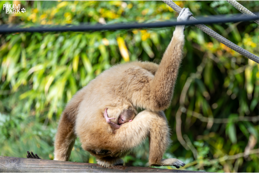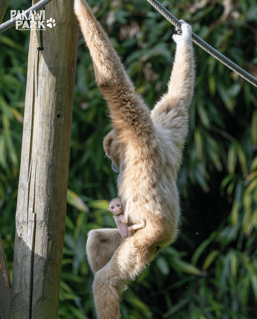 Wie goed kijkt, ziet een kleine ET die zich vastklampt aan de moeder. Baby witwanggibbons lijken iets weg te hebben van buitenaardse wezentjes, met hun grote kop en slanke ledematen. Ze hebben ook erg weinig vacht bij de geboorte. Toch is het een volkomen normale babygibbon die op 8 oktober het levenslicht zag in onze groep.